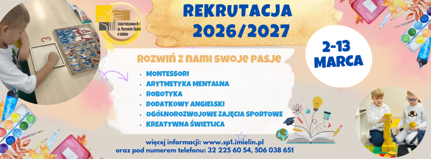 Rekrutacja do klasy I 2–13 marca Zapraszamy do Szkoły Podstawowej nr 1 w Imielinie! Dokumenty do…