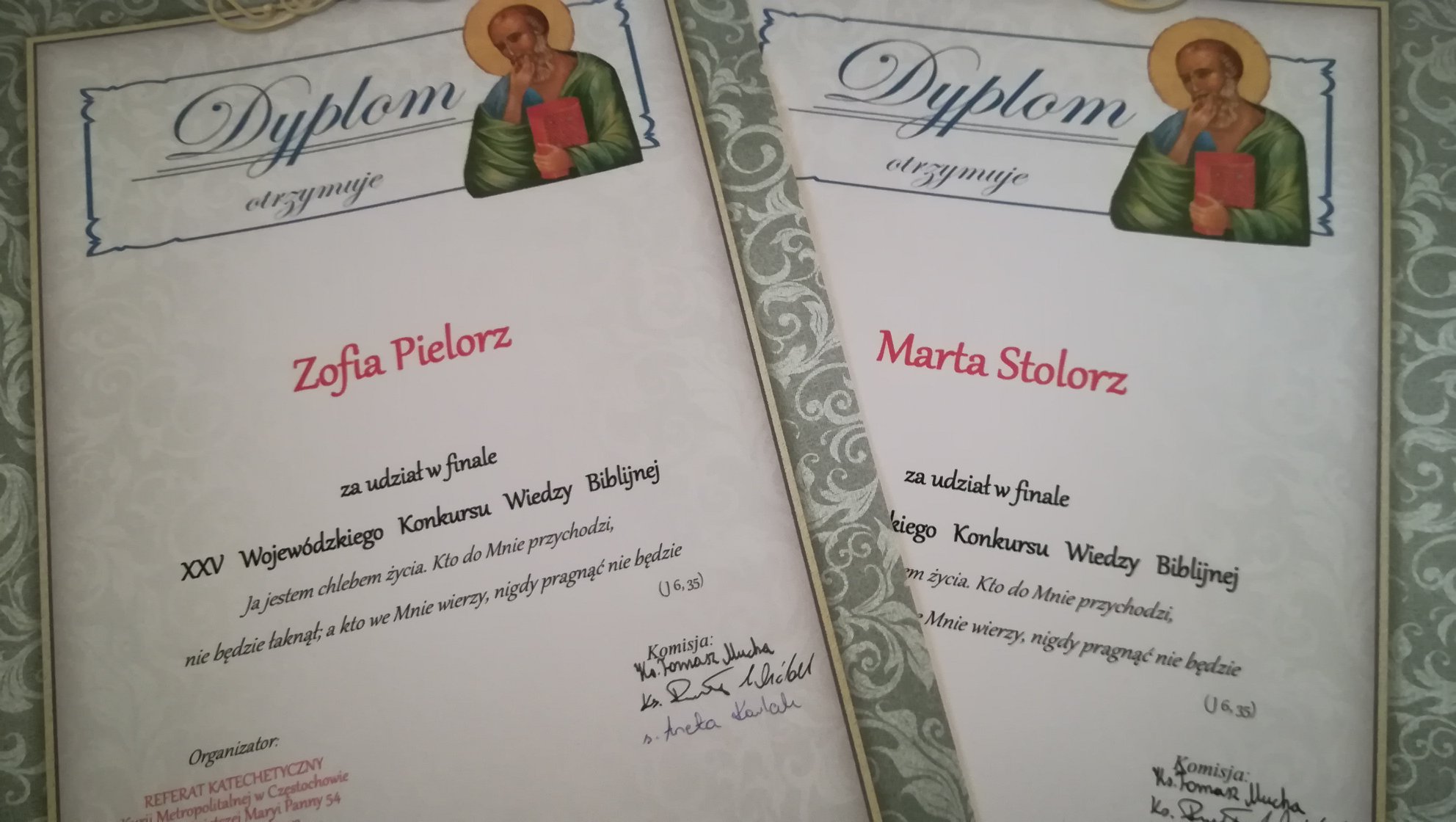 W miniony czwartek Zosia Pielorz i Marta Stolorz wzięły udział w finale XXV Wojewódzkiego Konkursu Biblijnego, który miał miejsce w Częstochowie. Z dumą przyjęliśmy fakt, że nasze uczennice nie tylko znalazły się wśród 60 najlepszych uczniów z całego województwa, ale zajęły bardzo dobre miejsca w górnej części tablicy wyników. Tym razem podium nieco nam uciekło, ale mamy ogromne powody do radości. Dziewczyny godnie reprezentowały naszą szkołę, miasto i powiat. Gratulujemy i życzymy dalszych sukcesów! PS: Po napisaniu testu mieliśmy okazję zwiedzać Jasną Górę i zjeść ciepły obiad. Dowody na zdjęciach.