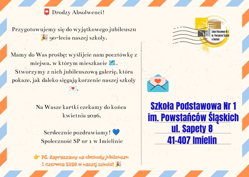 Jeśli macie chwilę, wyślijcie do nas pocztówkę z miejsca, w którym obecnie mieszkacie lub przebywacie (czy to w Polsce, czy na świecie). Na odwrocie możecie napisać kilka słów do społeczności szkolnej – wspomnienie, pozdrowienie albo krótką historię.