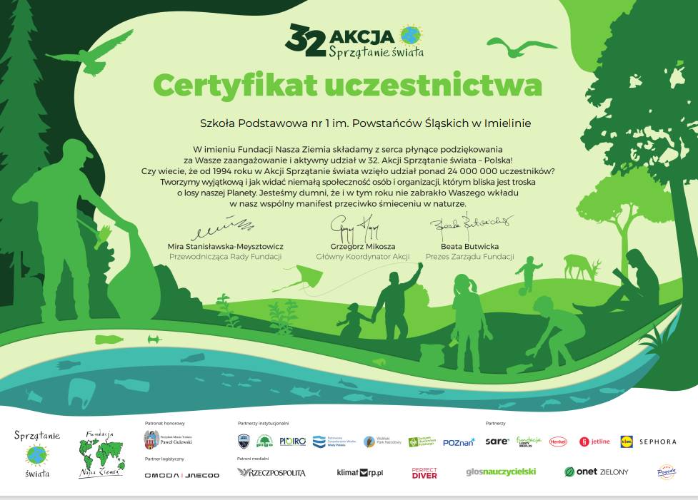 We wrześniu uczniowie klas czwartych wzięli udział w 32 Akcji Sprzątanie Świata – Polska! Uporządkowali tereny w okolicach ulicy Drzymały. Wcześniej przygotowali piękne tematyczne prace plastyczne, a dzisiaj szkoła otrzymała z rąk Fundacji Nasza Ziemia Certyfikat uczestnictwa w projekcie. FOTORELACJA Wizyt: 8