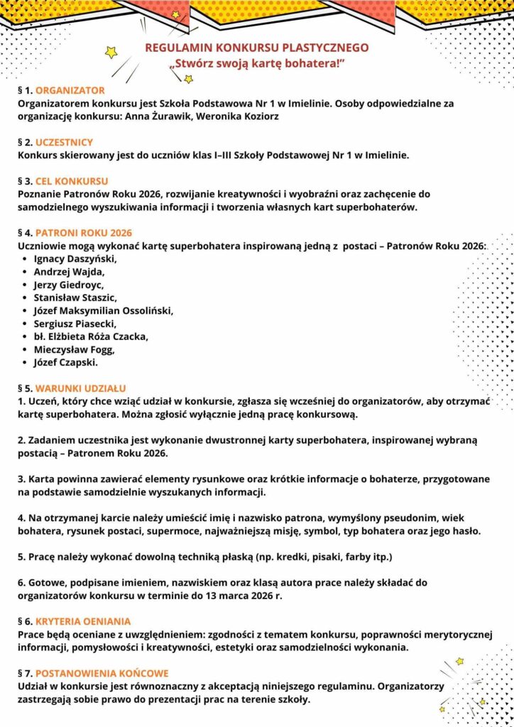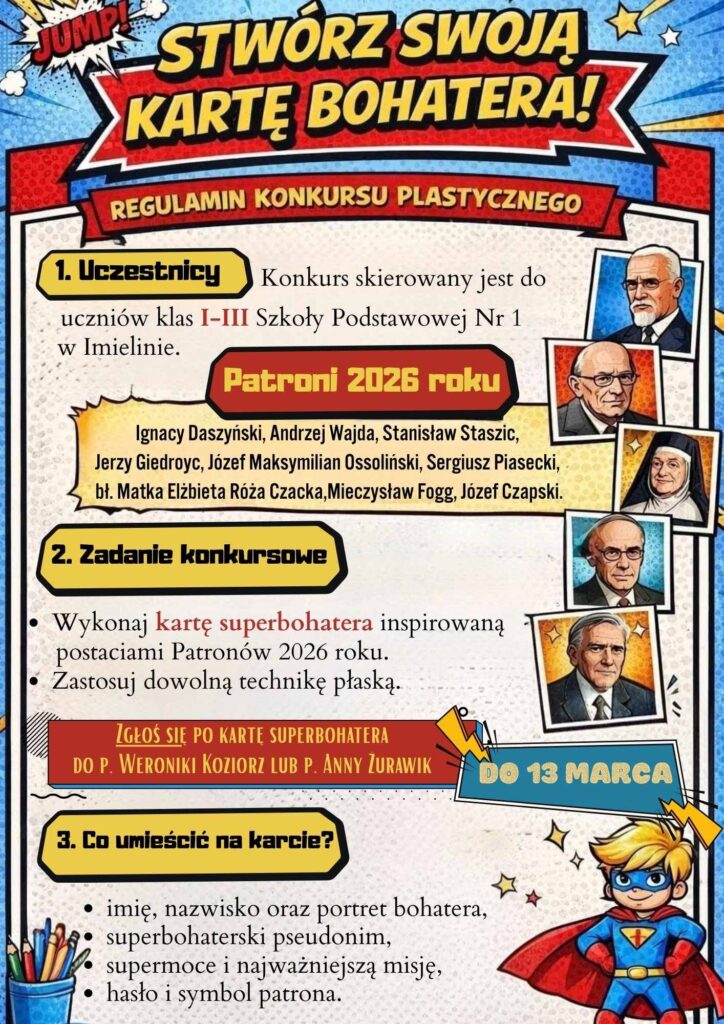 Zapraszamy uczniów klas I–III do udziału w szkolnym konkursie plastycznym „Stwórz swoją kartę bohatera!”. Zadaniem jest wykonanie dwustronnej karty superbohatera inspirowanej Patronami Roku 2026 – z rysunkiem, supermocami, symbolem i hasłem bohatera.
