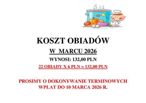 Informujemy, że w związku z wzrostem cen żywości od 1 września 2021 r. dzienna stawka żywieniowa za obiad dla ucznia wynosi 6,00 zł. Prosimy o terminowe dokonywanie wpłat za obiady do 10-go każdego miesiąca przelewem na konto bankowe szkoły:
