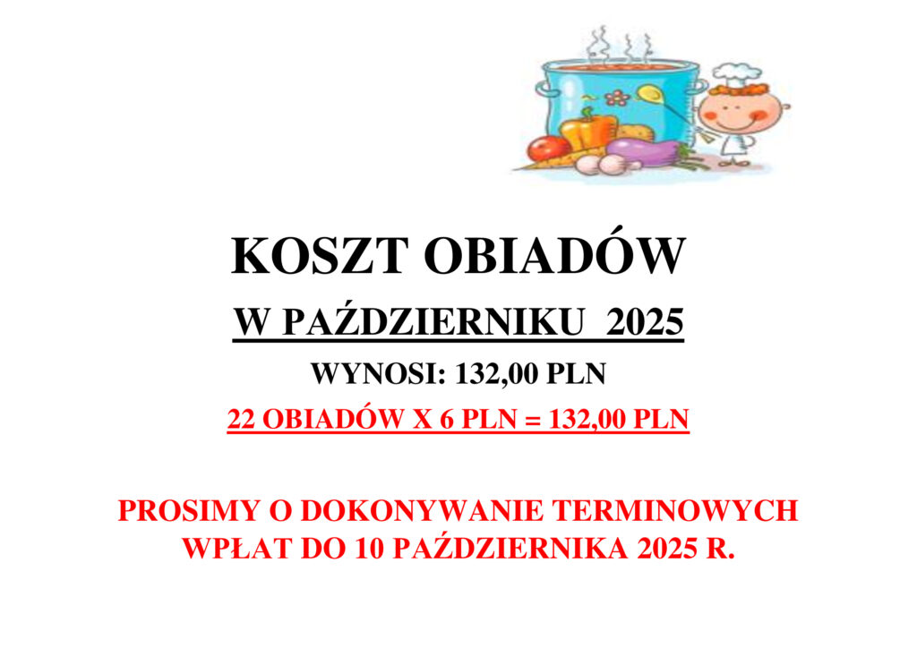 Informujemy, że w związku z wzrostem cen żywości od 1 września 2021 r. dzienna stawka żywieniowa za obiad dla ucznia wynosi 6,00 zł. Prosimy o terminowe dokonywanie wpłat za obiady do 10-go każdego miesiąca przelewem na konto bankowe szkoły: