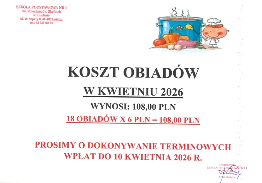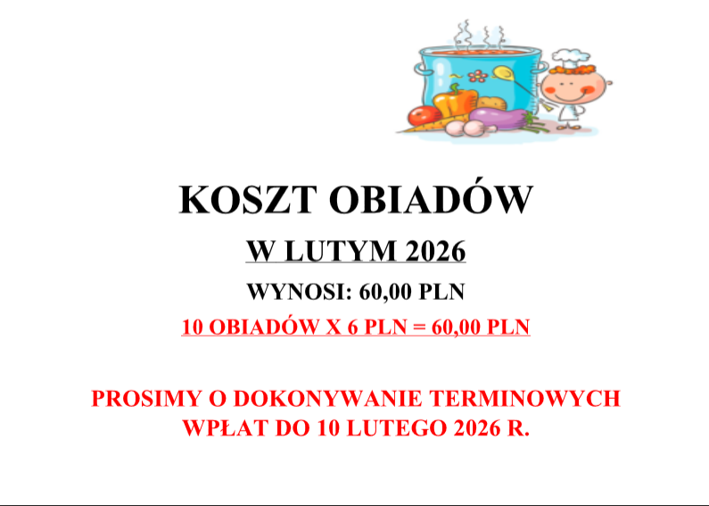 Informujemy, że w związku z wzrostem cen żywości od 1 września 2021 r. dzienna stawka żywieniowa za obiad dla ucznia wynosi 6,00 zł. Prosimy o terminowe dokonywanie wpłat za obiady do 10-go każdego miesiąca przelewem na konto bankowe szkoły: