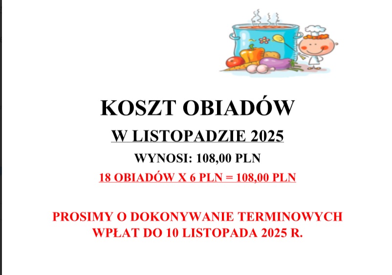 Informujemy, że w związku z wzrostem cen żywości od 1 września 2021 r. dzienna stawka żywieniowa za obiad dla ucznia wynosi 6,00 zł. Prosimy o terminowe dokonywanie wpłat za obiady do 10-go każdego miesiąca przelewem na konto bankowe szkoły: